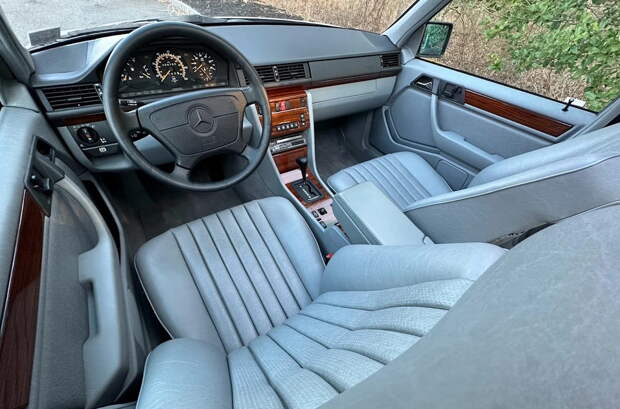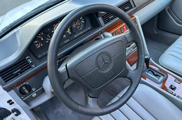 Любопытные детали — вентиляционные отверстия в переднем правом крыле и панорамный стеклоочиститель.В 1995 году владелец выложил за Mercedes-Benz E 300 около 40,5 тысячи долларов, и благодаря минимальной эксплуатации спустя 28 лет седан значительно прибавил в цене. Планка в 152 тысячи долларов означает, что покупатель янгтаймера мог приобрести практически любой новый «Мерседес».