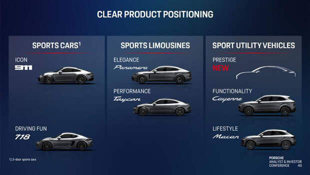 Появились новые подробности о третьем кроссовере Porsche, который имеет рабочий индекс K1 и примерно в 2027 году составит компанию моделям Macan и Cayenne. Если прежде ходили слухи, что это будет большой автомобиль с тремя рядами сидений, то слайд из презентации компании дал новую вводную. Флагманом окажется крупный купеобразный кроссовер, который станет аналогом нынешних моделей BMW XM, Lamborghini Urus и Aston Martin DBX. Не исключено, что эта третья модель полностью заменит нынешний Porsche Cayenne Coupe.