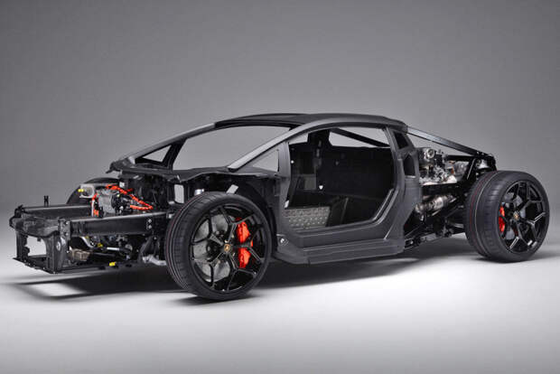Ключевое отличие от Авентадора — композитный передний подрамник: он сделан из короткого углеволокна, пропитанного смолой, и получился на 20% легче и вдвое жестче прежней алюминиевой конструкции. В целом новый кузов на 10% легче, чем у Авентадора, а жесткость на кручение выросла на 25%, до 40000 Нм/град.