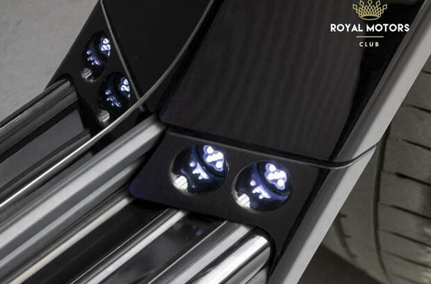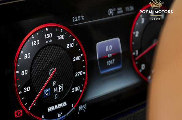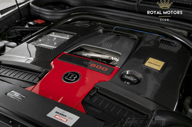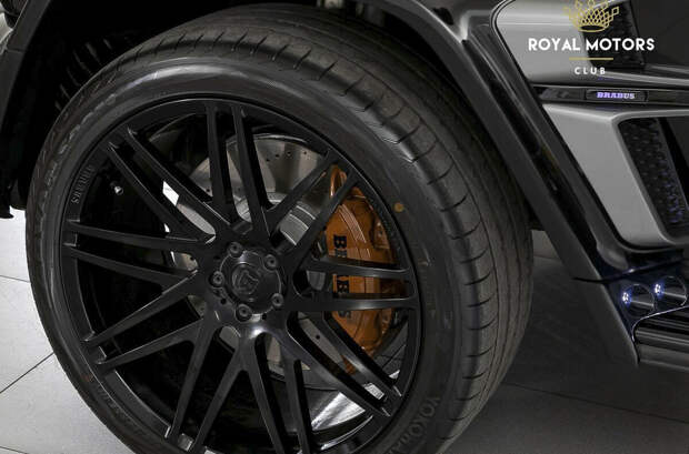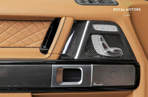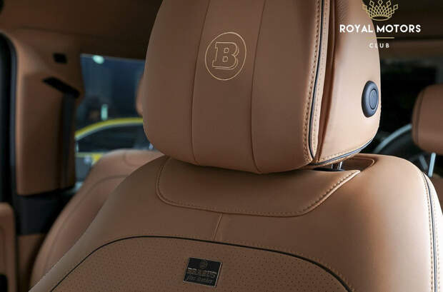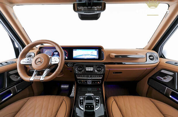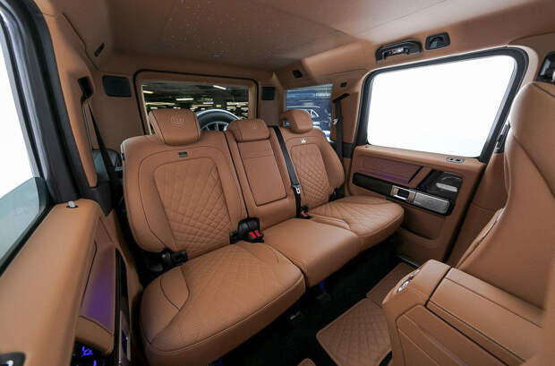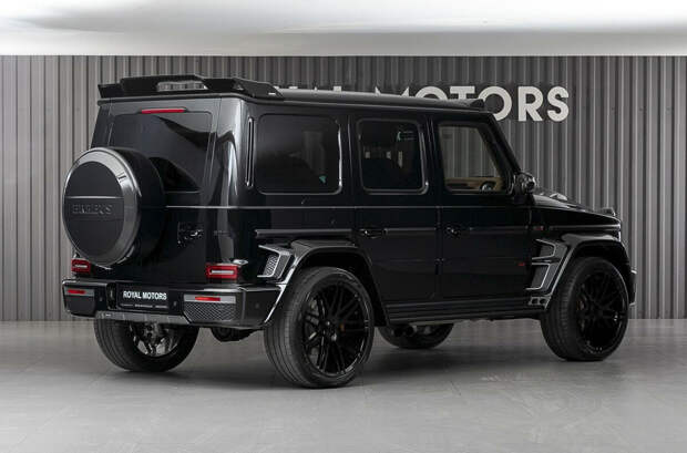 «Гелендваген» получил узнаваемый обвес с диффузорами и фирменные шильдики Brabus, активный выхлоп, люстру и спойлер на крышу, а также 23-дюймовые черные колесные диски Black Platinum. В салоне терракотовой расцветки — кресла с восемью массажными программами, акустика Burmester с 15 динамиками. Кроме этого, потолок внедорожника украшен световым рисунком «звездное небо».