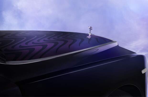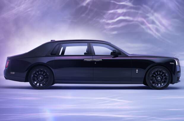 Основой проекта стал удлиненный Phantom Extended. Он окрашен в специально созданный колер Liquid Noir. Переливаться фиолетовыми, синими, пурпурными и золотистыми полутонами его заставляет зеркальный пигмент, который добавляют в финишное прозрачное покрытие.