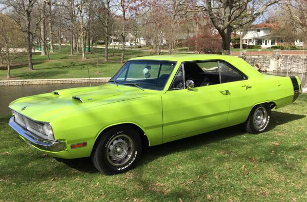 Если быть более точным, «Свингеры» черпают вдохновение в модели Dart Swinger. Этот компактный хардтоп сочетал мощный двигатель со стильным декором. У него был зеленый кузов (не всегда) с золотистыми акцентами и салон, украшенный деревянными вставками. Поэтому как их далекий предок, современные маслкары получили эмблемы Gold School, графику на корме и соотвествующий интерьер.