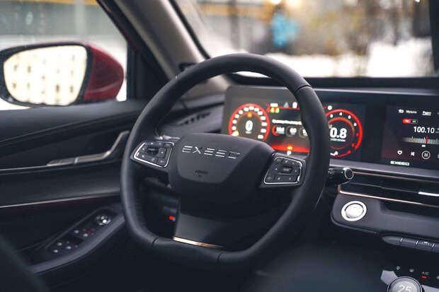 В салоне новшество только одно: вместо поперечного кармашка на центральном тоннеле (он всё равно был неудобен) появилась шайба управления внедорожными режимами. А рядом с ней на этой же новой панели — о чудо! — барабанчик регулировки громкости и ещё несколько «горячих клавиш»! В то время как ранее на переднеприводном Exeed я нашёл только один способ делать музыку громче-тише — клавишами на руле. Снаружи отличий у полноприводной версии так же немного, как в интерьере: это красные суппорты, новый дизайн колёс и буквы AWD на двери багажника.