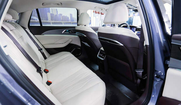 Разработчики гордятся тем, что сделали салон «пятерки» более мягким и уютным: заявлено, что качество отделочных материалов значительно улучшено. Седан имеет виртуальные приборы и проекционный дисплей, а всю центральную консоль занимает вертикальный планшет медиасистемы диагональю 12,3 дюйма. Есть голосовое управление и функция обновления «по воздуху».
