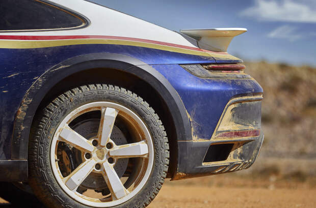 Для снижения массы также используются более легкий аккумулятор и лобовое стекло. Отдельно для спорткара можно заказать полукаркас безопасности, шеститочечные ремни и даже палатку.Купе 911 Dakar стандартно оснащено полноуправляемым шасси, динамическими опорами двигателя от 911 GT3 и регулируемой подвеской. Дорожный просвет здесь на 50 миллиметров больше, чем у исходного 911 Carrera 4 GTS. Кроме того, клиренс можно принудительно увеличить ещё на 30 миллиметров, до 190—195. С максимально задранной подвеской спорткар разгоняется до 170 километров в час, после чего машина автоматически опускается.