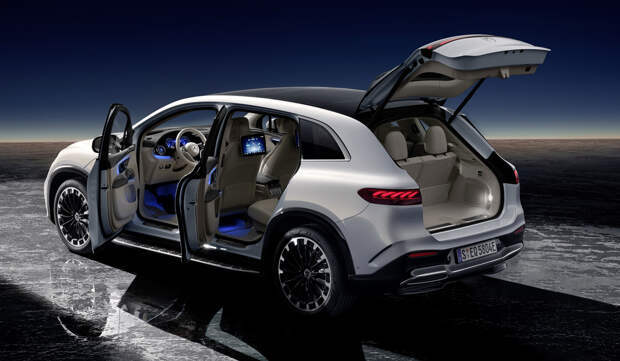 «Капитанских» сидений второго ряда среди опций почему-то не заявлено. Судя по всему, они появятся только у роскошной модификации Mercedes-Maybach EQS SUV, предвестником которого в прошлом году стал концепт-кар. Зато уже сейчас можно заказать третий ряд с двумя раздельными креслами. В этом случае объем багажника — только 195 литров. Со сложенным третьим рядом — от 565 до 800 литров, а со сложенным вторым рядом — 2020 литров.