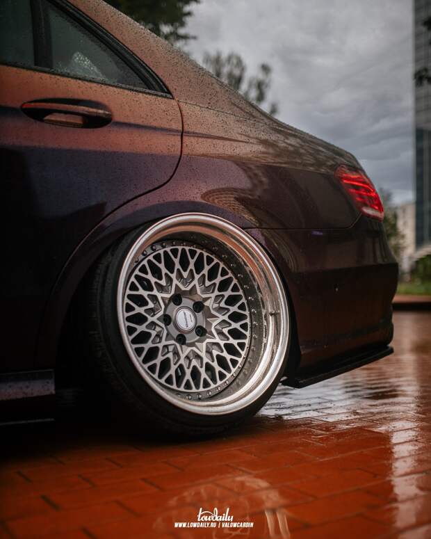 В 2022 году Андрей начал поиски колес, которые будут задавать стиль всей комнате. Work Gran Seeker CCX 19” диаметра выглядят на Mercedes довольно броско за счет полированной полки и дизайна, максимально отдаленного от заводских дисков. Параметры 10j с вылетом -19 спереди и 11j с вылетом -12 сзади сразу дали понять, что легкого сражения за размещение в арках не будет. Даже с винтами BC Racing и развальными рычагами пришлось крепко подумать, как впихнуть невпихуемое. Но это была только первая итерация.
