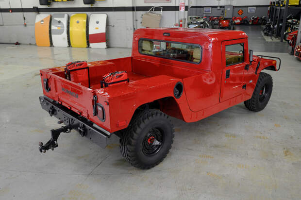 Ярко-красный Hummer H1 с чёрными бамперами и колёсами, обутыми во внедорожные покрышки, имеет двухместный салон с отделкой кожей песочного цвета. С учётом пробега менее 18 000 миль с момента выпуска в 1995 году, внедорожник практически не имеет следов износа.