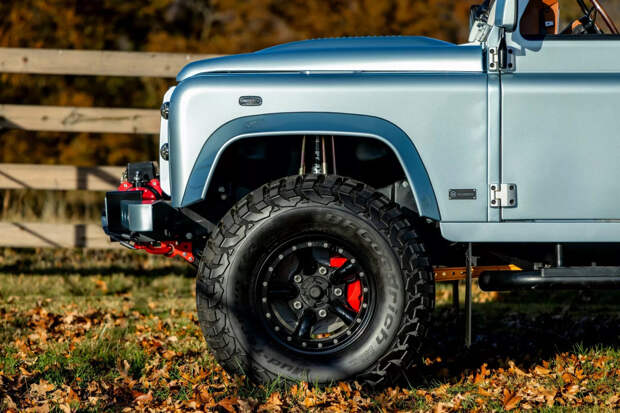 Также на Defender установили более мощные тормоза. Среди прочих элементов тюнинга — мощные подножки и новые колесные диски с внедорожными шинами, а также рулевое колесо с деревянным ободом.