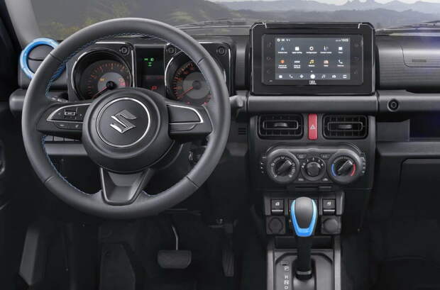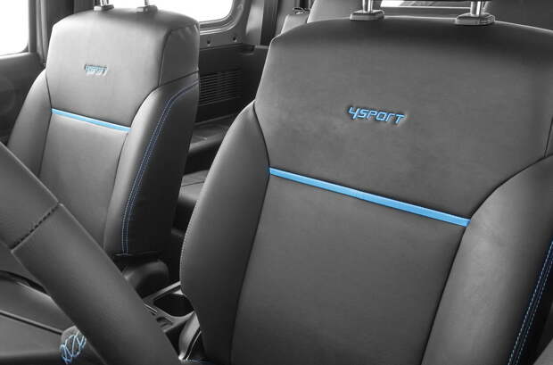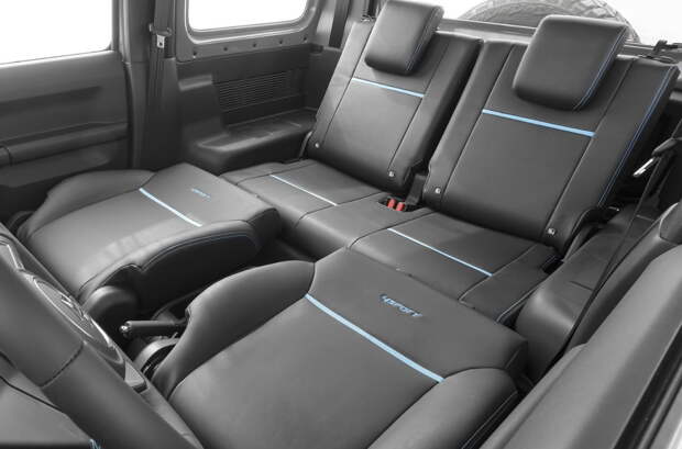 Передние кресла Suzuki Jimny могут складываться, образуя условно ровную поверхность, что пригодится на природе. В модификации 4Sport салон принципиально не изменился, но об исключительности внедорожника напомнят голубые акценты — яркая прострочка, пластиковое основание селектора «автомата», окантовка воздуховодов и вышивки на спинках кресел.