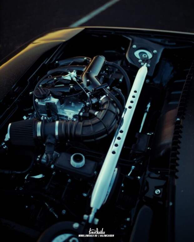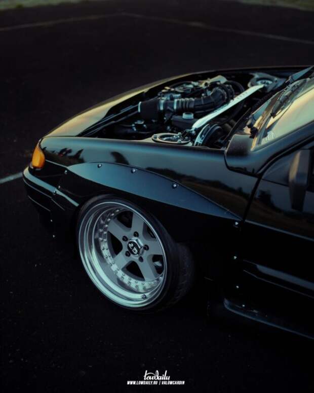 Теперь перейдем к технике. Диски Panasport G7 16” Саша расширил до 9” спереди и 10.5” сзади. Если вы вдруг забыли, колесные арки Самары-2 не настолько большие, поэтому спроектировали кастомное расширение, чем-то напоминающее rocketbunny. Кастомные стойки и кастомные пружины, а также дополнения в задней балке позволили сделать машину низкой, но сохранить работоспособность подвески. Стандартная операция – двигатель и КПП подняли на 6 сантиметров вверх, не забыв сделать пропилы в лонжеронах.
