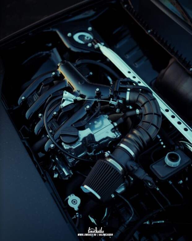 В 2018 году отец нашего героя познакомил его с технологией промышленного нанесения хром-никеля. К Саше в голову приходит концепция шейвинга подкапотного пространства с использованием хромированных элементов. Всё лишнее, вроде блока предохранителей и бачка омывателя, он переносит в скрытые места. После этого то, что можно отполировать, становится хромированным. Скрывать такую роскошь и богатство за капотом было бы преступлением, поэтому Саша с помощью болгарки делает то, что он называет полукапотом.