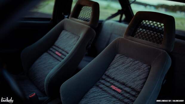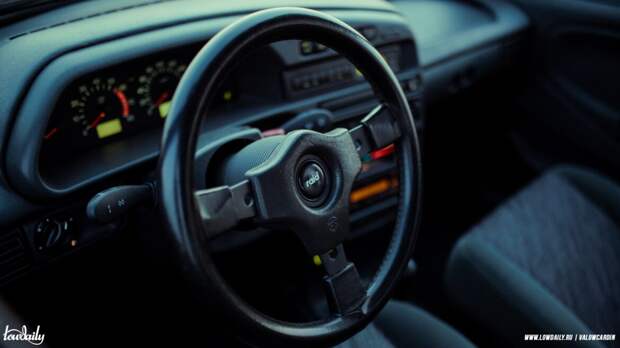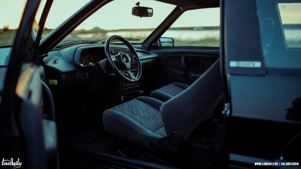 В интерьере Саша отдал дань экспортным Самарам-1: дилеры разных стран устанавливали на них множество разных дополнительных опций, часть из которых удалось найти в хорошем состоянии. Руль Raid, сиденья Recaro и люк Webasto – и вот уже в машине значительно приятнее находиться. Только что низкой панели коричневого цвета не хватает.