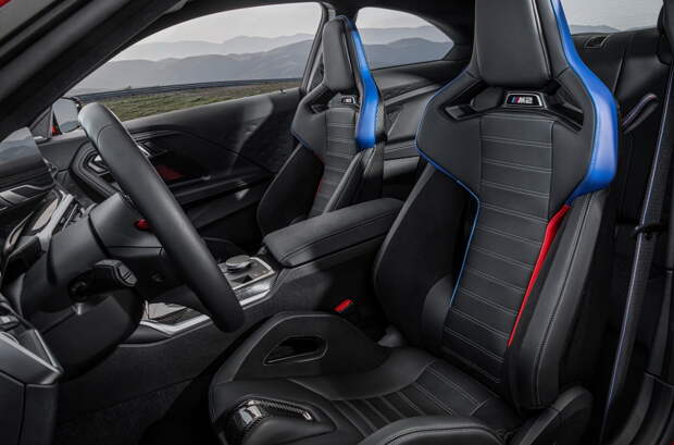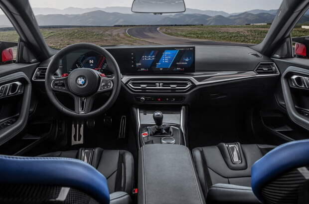 В салоне BMW M2 без сюрпризов: всем купе положен цифровой кокпит с 12,3-дюймовым дисплеем виртуальных приборов, 14,9-дюймовым тачскрином мультимедиасистемы iDrive 8 и встроенной навигацией. За спортивные сиденья, гоночные ковши, проекционный экран, обогрев руля, беспроводную зарядку для гаджетов и поддержку eSIM 5G нужно доплачивать.