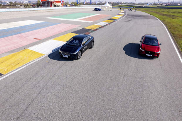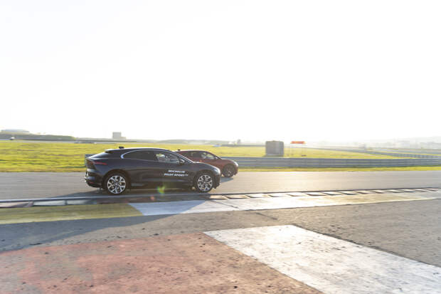 Чтобы продемонстрировать улучшенный выбег, взяли электрокроссоверы Jaguar I-Pace, которые отличались между собой только шинами. Параллельный старт, разгон до установленной ограничителем скорости 40 км/ч. В контрольном створе включаем «нейтраль» и наблюдаем, какой автомобиль укатится дальше. Действительно, в большинстве случаев электрокар на Pilot Sport EV останавливался на несколько метров дальше, чем на… почему-то уже Pilot Sport 4S (а не SUV, как в буклете).