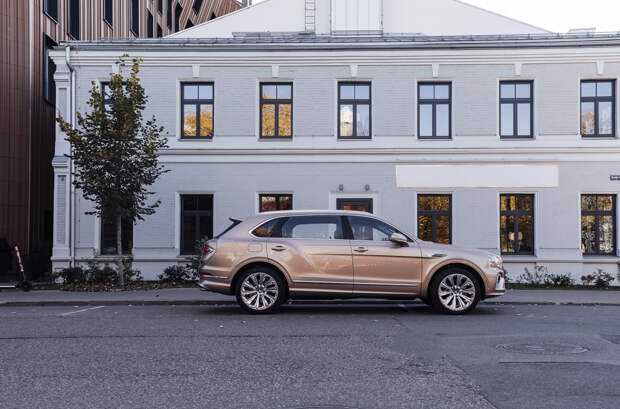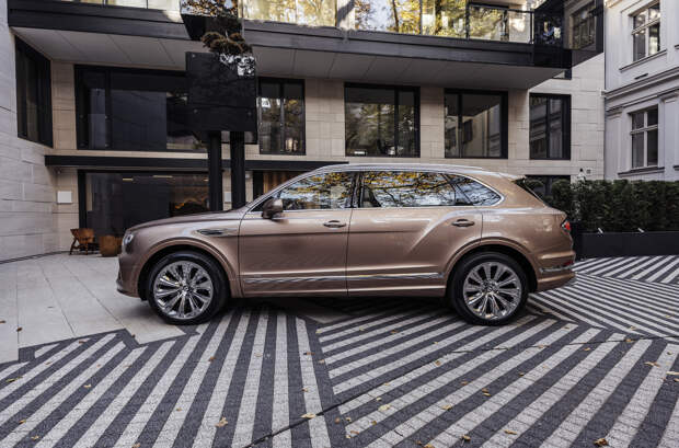 Внешне удлиненный Bentayga EWB отличается от обычной Bentayga радиаторной решеткой с вертикальными ламелями и 22-дюймовыми дисками с полированной поверхностью.