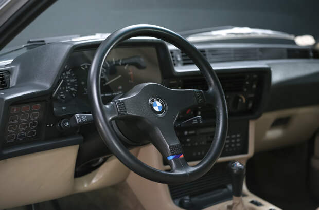 За 35 лет эксплуатации этот BMW M6 прошел 138 400 километров. Кузов спорткупе окрашен в темно-синий металлик, который сочетается с бежевым интерьером из натуральной кожи. Образ автомобиля дополняют 17-дюймовые колесные диски BBS с низкопрофильной резиной. В салоне купе установлено рулевое колесо линейки M-Tech I, бортовой компьютер, кондиционер и электрические стеклоподъемники.