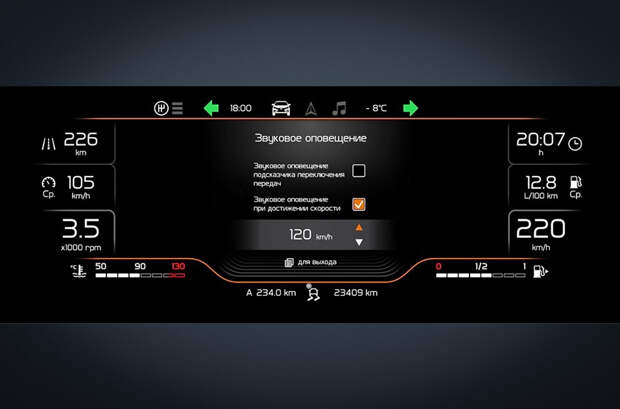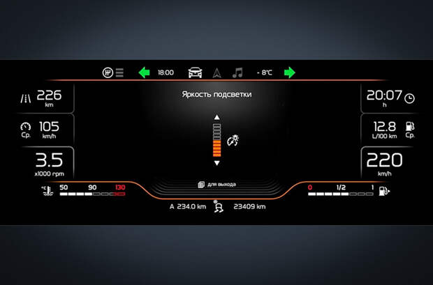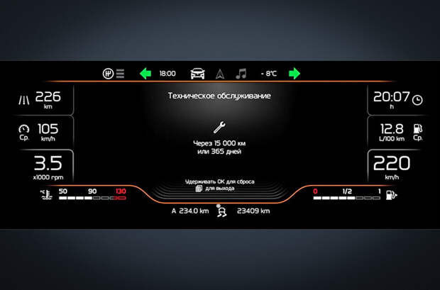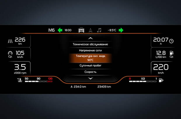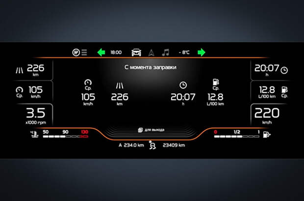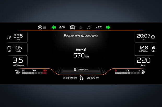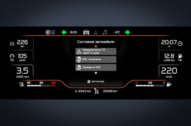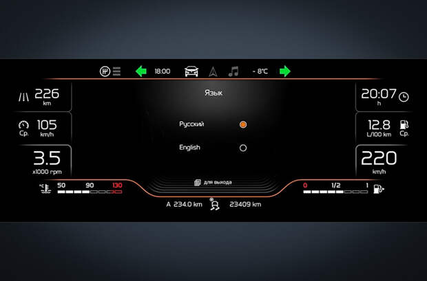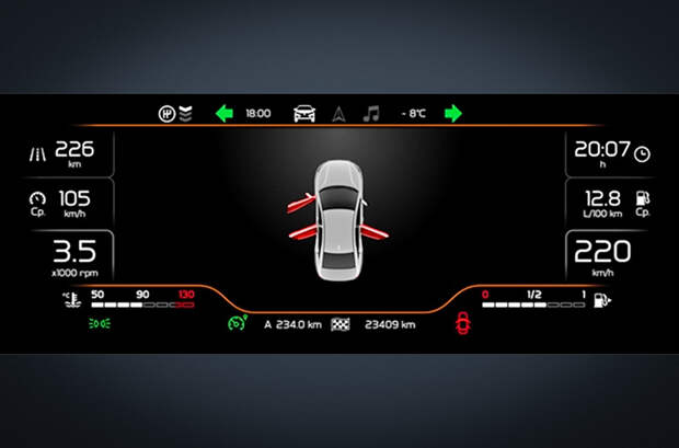 «Приборку» в новом дизайне рассекретил Роспатент: на фотографиях можно рассмотреть кластер цифровых инструментов, от предупреждения о незакрытых дверях и уровня топлива в баке в правом нижнем углу до скорости, выбранной передачи, работающих поворотников и температуры за бортом в верхней части экрана.