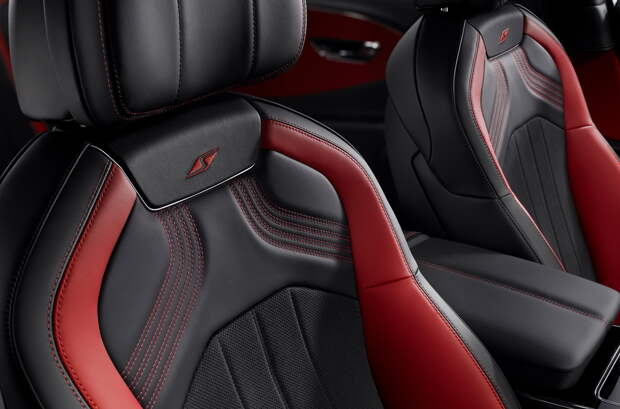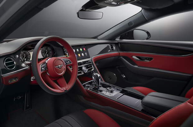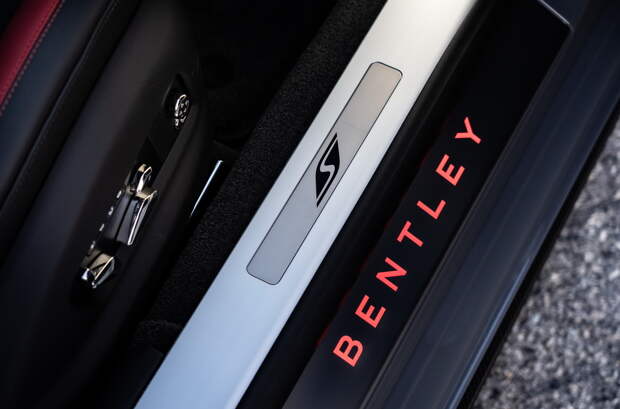 Салон спортседана по умолчанию оформлен двухцветной кожей, есть яркая прострочка и вышивки S на спинках, передней панели и порогах. Дизайн приборной панели выполнен в духе купе Continental GT Speed, а у демонстрационного автомобиля интерьер с карбоновыми вставками. Впрочем, можно заказать любые другие сочетания и даже отказаться от части декора.