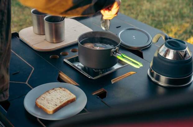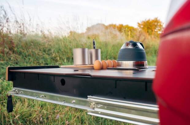 Также сзади в Egoe добавили многофункциональный выдвижной ящик. В нем установлены небольшая газовая плита, раковина со складным краном и шлангом. Остальная площадь предназначена для приготовления пищи, есть также различные отсеки для хранения посуды и кухонных принадлежностей. Кроме этого, создатели предусмотрели оконные шторки в салоне и раскладной стул.