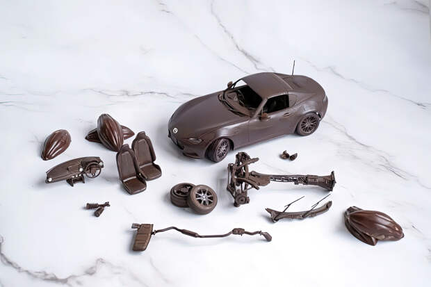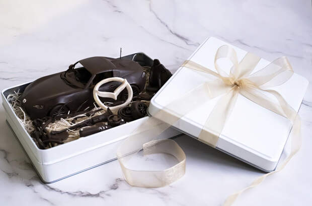 Фотографии необычного кондитерского изделия были опубликованы в социальных сетях Mazda Japan в День святого Валентина: в наборе с шоколадным автомобилем идут запасные детали, в числе которых выхлопная система, пара кресел-ковшей, передняя панель с рулевым колесом, подрамник с тормозами и другое. Конфеты упакованы в коробку с бантом – это был бы отличный подарок для фанатов Miata, однако набор существует в единственном экземпляре.