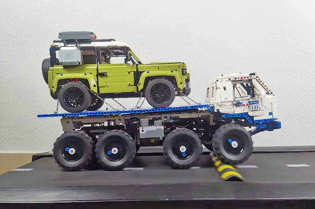 На YouTube-канал Lego Life опубликовали видеоролик, в котором провели необычное испытание игрушечных автомобилей, собранных из конструктора Lego. Энтузиасты решили проверить, как справится подвеска чешского восьмиколесного эвакуатора Tatra T813 с искусственными неровностями на беговой дорожке. Для полноты испытаний на платформе машины закрепили Land Rover Defender, тоже собранный из деталей Lego.