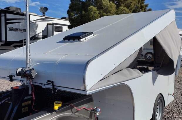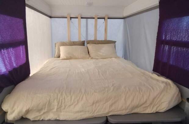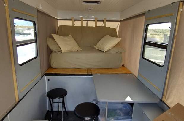 Чтобы удержать вес в пределах 680 килограммов, хозяин Beetle решил отказаться от бортового водоснабжения. В остальном у него получился полноценный кемпер, пусть и с весьма скромным убранством. Queen-size кровать складывается, превращаясь в небольшой диванчик, а перед ним обустроена кухонная зона с откидным столиком, плитой и полками для хранения.