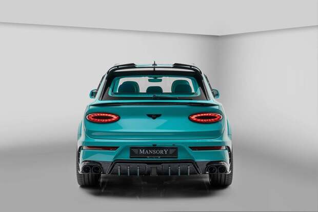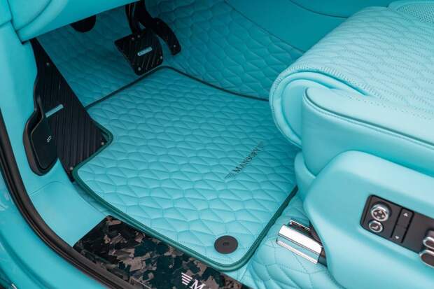 Ярко-бирюзовая кожа в интерьере сочетается с декоративными панелями из углепластика, а на потолке появилось светодиодное «звездное небо». Но по желанию в Mansory что для кузова, что для салона могут выбрать другой цвет декора.