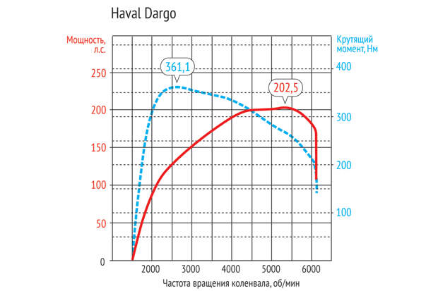 Следующий на очереди — Dargo. Все повторяется точь-в-точь, разве что звук ременного привода стенда в этот раз громче, двигатель и колеса удалось разогнать до более высоких оборотов — и на отметке 5350 об/мин мы получили 202 л.с. При том что в России обещаны 192 силы, а в Китае, где Dargo продается как Haval DaGou, — 211 л.с.