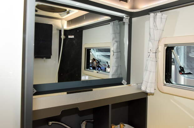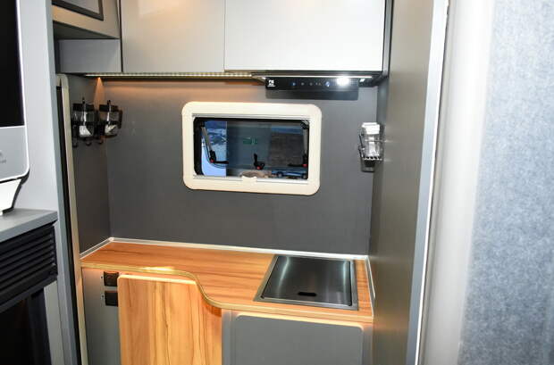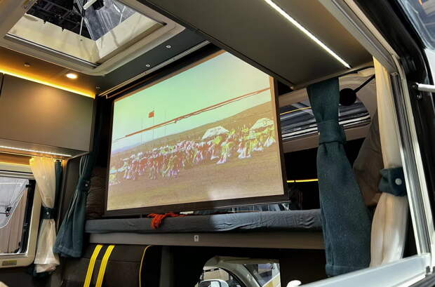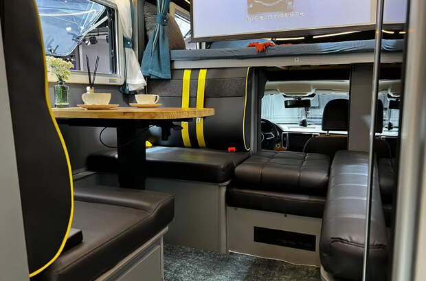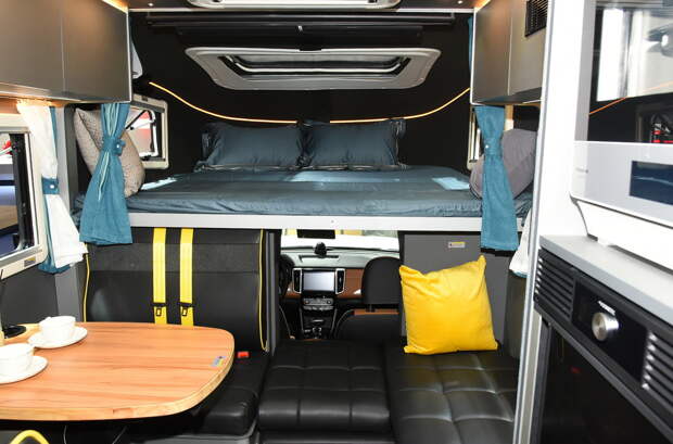 В верхней части грузовичка предусмотрено просторное спальное место для двоих, на первом этаже есть биотуалет, раковина, душ, кухня со столиком и проектор. Попасть в кабину можно прямо из автодома, но для гостей предусмотрен отдельный вход со ступенькой. «Грязевые» покрышки и буксирная проушина пикапа намекают на возможности активного отдыха.