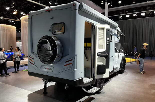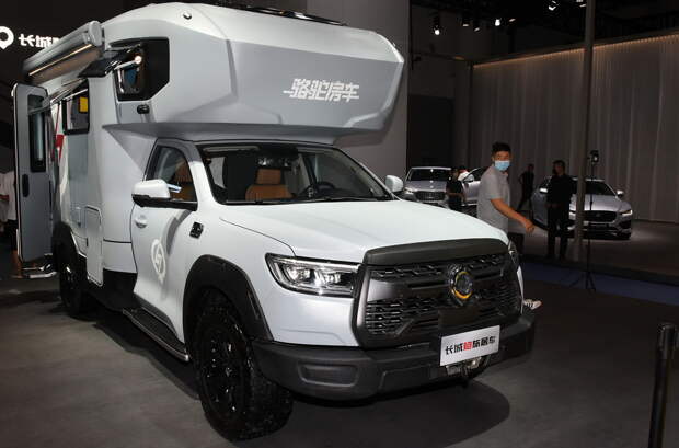 На стоянке автомобиль можно зафиксировать на дополнительных ножках, а по правому борту открыть навес.Китайцы показали внедорожный автодом с огромной кроватью, кухней, санузлом и душевой. Основой для портативного жилища послужил грузовичок Great Wall Pao (известен в России под именем Poer), но вместо грузовой платформы установили композитную надстройку. Особенность китайского автодома — большое количество пластиковых окон. На стоянке автомобиль можно зафиксировать на дополнительных ножках, а по правому борту открыть навес.