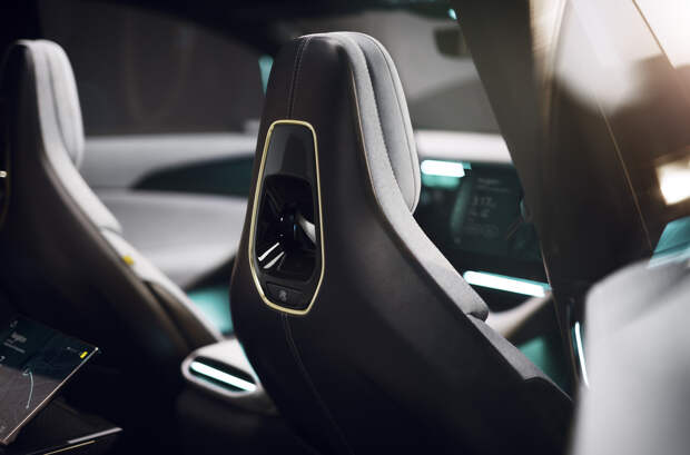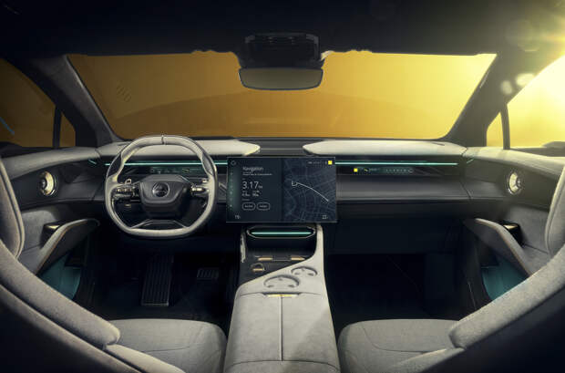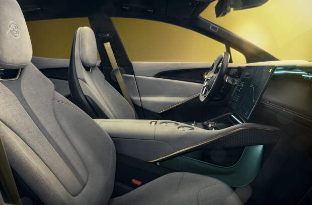 В салоне применены прочный синтетический текстиль и легкие смеси шерсти, которые весят в два раза меньше, чем натуральная кожа. На передней панели разместили крошечную приборную панель высотой всего три сантиметра, на которой по умолчанию отображается только самая нужная информация. Такая же панель есть со стороны пассажира, а между ними – складной 15,1-дюймовый экран «мультимедийки», обеспечивающий доступ к 95 процентам функций за три прикосновения. Когда в нем нет необходимости, он автоматически складывается.