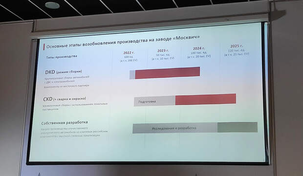 Уже начались подготовка CKD-производства (со сваркой и окраской кузовов) и поиск локальных поставщиков. Сейчас идет разработка проектной документации и заказ необходимого оборудования, его монтаж должен начаться во втором квартале следующего года. На четвертый квартал намечено производство тестовых кузовов, а старт серийного выпуска должен состояться в первом квартале 2024-го. В течение этого года Москвич планирует полностью перейти с DKD на CKD: целевой тираж из 100 тысяч автомобилей (включая 20 тысяч «электричек») будет примерно поровну разделен между двумя типами производства.