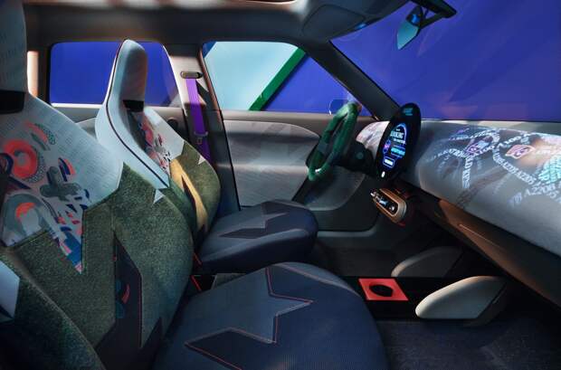 Aceman получил 20-дюймовые колесные диски с шестью широкими спицами, слегка изогнутыми внутрь к ступицам.Салон шоу-кара богато украшен паттернами и отделан подчеркнуто экологично: вместо натуральной кожи использован переработанный текстиль. Центральный дисплей сохранил форму круга, но теперь это плоский планшет, «парящий» над поверхностью. Он играет роль и приборной панели, и экрана информационно-развлекательной системы. Под ним в лаконичном блоке расположен ряд аналоговых переключателей: кнопка стояночного тормоза, селектор режимов движения и регулировка громкости аудиосистемы. Мягкий материал передней панели может также служить подложкой для проекции атмосферных узоров либо карты.