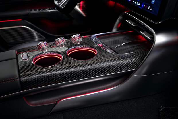 В качестве акцентов авторы салона применили неприкрытый углепластик, эффектную интерьерную подсветку и стильные дефлекторы вентиляции. Особая гордость — двухсекционная электрохромная панорамная крыша, где можно регулировать прозрачность каждой секции.