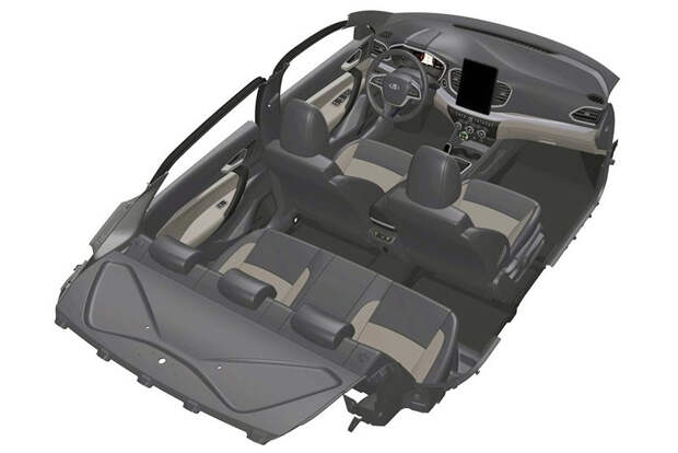 Только теперь появился патент с полноценными изображениями, причем на них представлены сразу три уровня оснащения. Вверху показана топ-версия — с большим вертикальным планшетом медиасистемы, виртуальными приборами, шайбой системы Ride Select и двухцветной обивкой.Средняя комплектация — это компактный экран мультимедийки, аналоговые приборы и черная отделка. Наконец, в базовой версии нет вообще никакой аудиосистемы (вместо нее слоты для установки магнитолы), отсутствует центральный бокс между передними сиденьями и подлокотник. Правда, теперь уже не факт, что интерьер обновленной Весты будет выглядеть именно так. Старт производства отложен до начала 2023 года, и с переходом на российскую компонентную базу салон может серьезно измениться.