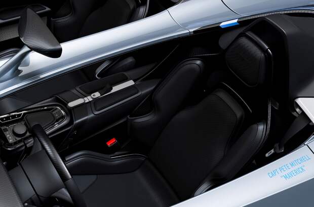 Pete Michell 'Maverick’» (главный герой фильма) на водительской двери.Под прозрачными крышками обтекателей можно заметить шлемы, раскрашенные в цвета шлема Пита Митчелла. Цена, как обычно, не называется, но она определённо будет выше начальных 765 тысяч фунтов стерлингов (55,7 млн рублей).