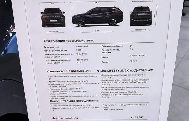 Стройной картины с ценами, увы, тоже. Например, кроссовер на фото стоил 4 млн 214 тысяч рублей (с учетом дилерских «допов»), но обзвон других московских автосалонов показал, что официальный Tucson N Line можно купить за 3 млн 650 тысяч рублей, и это без скидок за trade-in и кредит. За машины в топ-версии High-Tech в Москве просят 4,2—4,6 млн рублей, но в других городах встречаются предложения и за 4 млн, то есть разброс немалый.