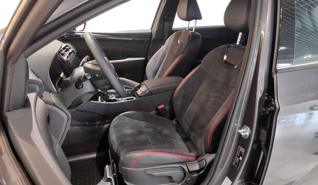 Tucson N Line предложен в трех разных комплектациях (Lifestyle, Prestige и High-Tech), которые по уровню оснащения соответствуют аналогичным вариантам исходного кроссовера. На наших фотографиях — автомобиль в комплектации Lifestyle с аналоговыми приборами, восьмидюймовым экраном медиасистемы и ручной регулировкой сиденья водителя.