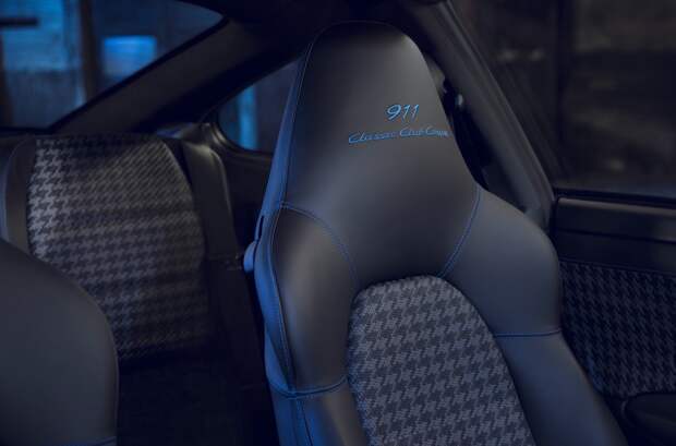 В салоне 911 Classic Club Coupe можно найти накладки на пороги из нержавеющей стали, обивку кожей и перфорированной алькантарой, а также табличку с надписью «911 Classic Club Coupe No. 001/001», подтверждающую единичный тираж. Центральные вставки на сиденьях и в дверях с узором «гусиные лапки» сплетены из тонких полосок черной и серой кожи, причем в Porsche Classic применили твиловое, или диагональное плетение.
