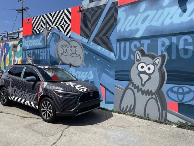 Творцы не просто создали уличные рисунки в трех городах, но и оформили в соответствии со своим стрит-артом Toyota Corolla Cross.В июне 2022 года Toyota обновила семейство моделей Corolla для североамериканского рынка. Чтобы привлечь внимание к модернизированному «внедорожному» хэтчбеку Corolla Cross, еще до официальной премьеры рестайлинговой версии в США развернули рекламную кампанию Just Right, участие в которой приняли три современных художника. Творцы не просто создали уличные рисунки в трех городах, но и оформили в соответствии со своим стрит-артом Toyota Corolla Cross.