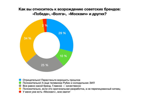 В опросе поучаствовали 1545 человек. Из них 523 человека положительно относятся к возрождению советских марок, однако только в том случае, если выпускаемые под ними автомобили будут оригинальной разработкой, а не перелицованными китайскими моделями. Чуть меньше -- 447 человек -- не поддерживают возвращение старых брендов и призывают не ворошить прошлое.