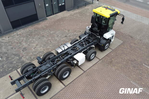 с. GINAF удлинил раму, снабдил переднюю ось временным приводом Hydroaxle+ и установил заднюю тележку с электронной системой подруливания последней оси (EVS) и гидропневматической подвеской с электронным управлением (HPVS). Такая подвеска выполняет функцию стабилизатора поперечной устойчивости и автоматически распределяет нагрузку по осям.