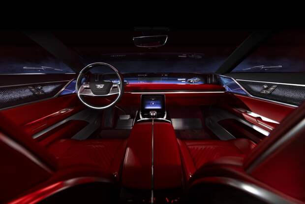 Интерьер, отделанный красной кожей, получил четыре раздельных кресла и пять дисплеев, включая 55-дюймовый экран на всю ширину передней панели, у которого есть «цифровые шторки», скрывающие от водителя изображение с зоны переднего пассажира. На дверях расположены пульты управления сиденьями и мини-экраны для камер заднего вида.