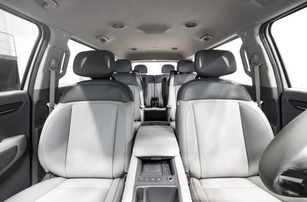 За дверьми с утопленными заподлицо ручками скрывается просторный салон на шесть либо семь мест. Пассажиры первого и второго ряда могут одновременно откинуть сиденья во время долгой стоянки, например, когда машина заряжается. Кроме того, раздельные кресла второго ряда поворачиваются в сторону двери для удобства посадки и на 180 градусов, чтобы было проще общаться с галеркой.