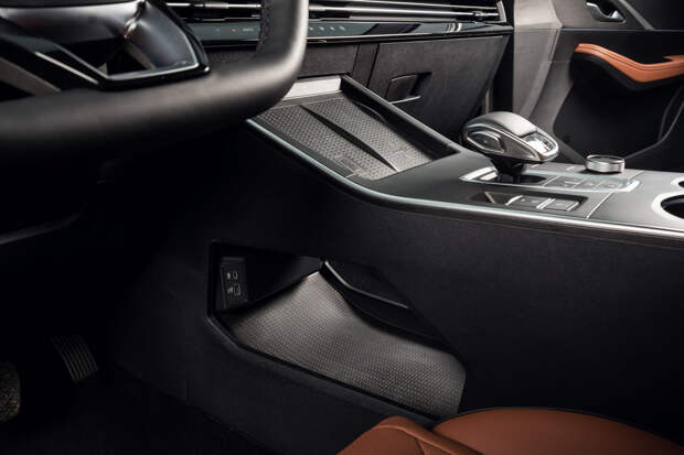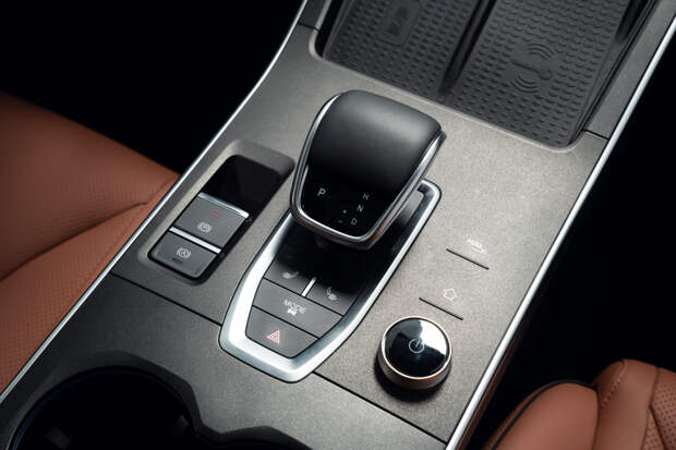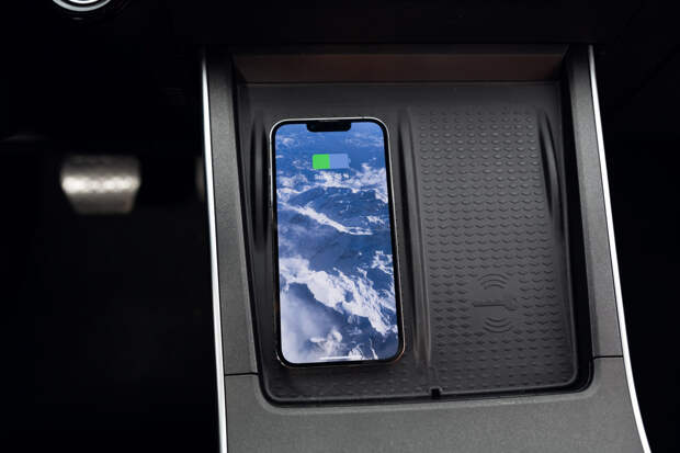 А сдвоенная площадка под телефон вообще великолепна — ну почему никто не додумался до этого раньше! Можно держать там два гаджета одновременно или выбрать куда положить единственный: слева работает беспроводная зарядка (и довольно мощная), а справа обычный коврик. При этом полочка расположена под наклоном — так, что можно даже читать чаты в мессенджерах (ведь музыка и навигация доступны через «карплей» на большом экране мультимедийки). Лучшее решение для хранения мобильника из всех что я видел.