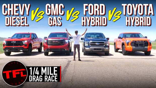 Авторам канала The Fast Lane Truck в очередной раз удалось удивить публику выбором героев для дрэг-рейсинга. Проект специализируется на сравнении пикапов, но на сей раз блогеры превзошли сами себя — собрав в одном заезде Chevrolet Silverado, GMC Sierra AT4X, Ford F-150 Hybrid и Toyota Tundra Hybrid — устроители необычной дрэг-гонки устроили фактически сравнение разных типов силовой установки.