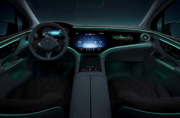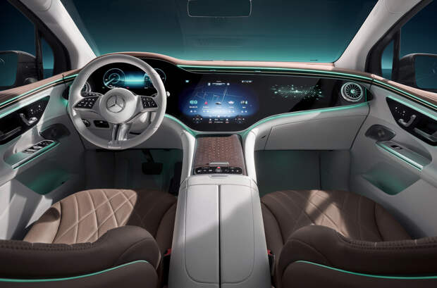 Гиперэкран достанется только топовым версиям Mercedes-Benz EQE SUV, а в более простых комплектациях будут только два раздельных дисплея. В числе других особенностей оформления – фоновая подсветка по контуру панели и в дверных картах, узкая прорезь центральных вентиляционных дефлекторов и боковые дефлекторы, выполненные в форме авиационных турбин. В отделке применены натуральное дерево и алюминий.