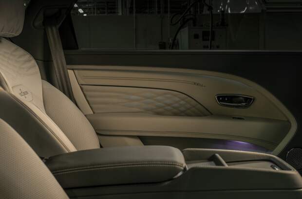 Задние двери оснащены электроприводом и открываются по нажатию кнопки. Покупателям не придется доплачивать за ковры с высоким ворсом, контрастную прострочку сидений и 1720-ваттную аудиосистему Naim for Bentley с 20 динамиками. Однако пара планшетов диаметром 10,1 дюйма для задних пассажиров (Bentley Rear Entertainment) в стандартное оснащение не включены.
