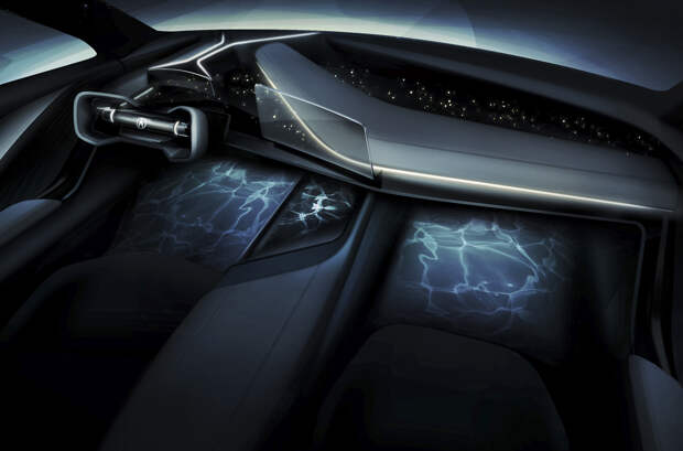 В интерьере – минимализм и геометрические формы. В салоне установлены два прозрачных экрана, а руль-бабочка, больше напоминающий штурвал, убирается в переднюю панель при активации автопилота. В этом режиме на дисплеях проигрывается расслабляющая анимация. Что касается отделки, то использованы исключительно экологически чистые материалы: дерево, переработанный пластик, акрил и алюминий.